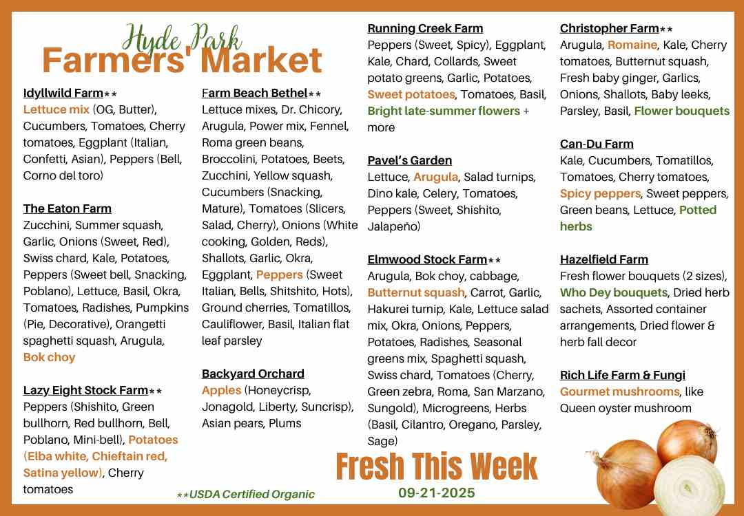 Choose from a wide variety of vegetables, fruits, meats, eggs, cheeses, pantry items, herbs, cut flowers, garden plants, and artisan prepared foods—including rare heirloom veggie varieties and heritage breed meats. Hyde Park Farmers’ Market is known as a “growers’ market.” Offerings come from local family farms that employ regenerative and humane practices.
